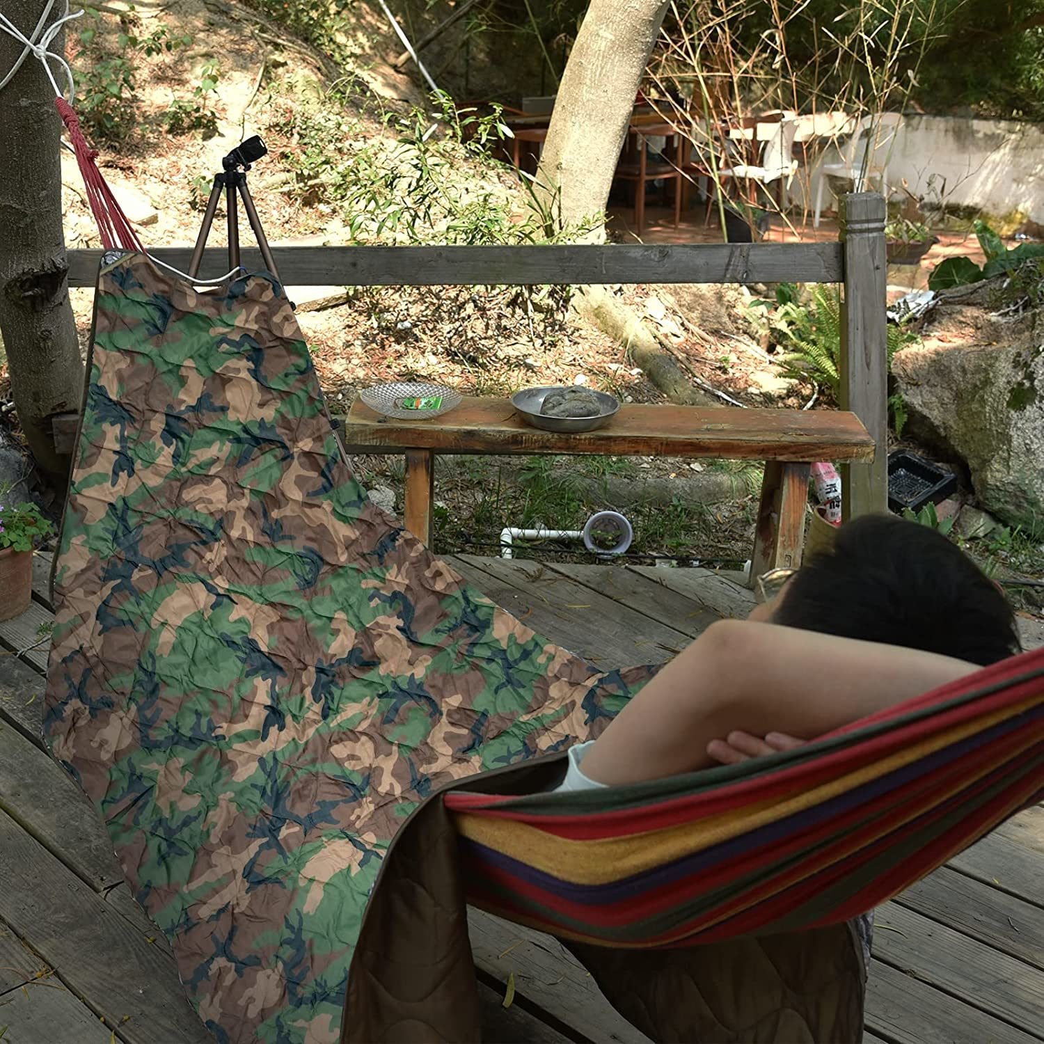 Material:210T Ripstop and filled with spray-bonded cotton WATERPROOF AND WARM BLANKET: The Woobie camo blanket is made of 210T Ripstop and filled with spray-bonded cotton; prevent water from immersion to poncho liner blanket and keep you warm and cozy; widely used in various harsh environments. One-sided with Camo Pattern; another-sided with Deep Khaki. MEASUREMENTS: This Military Emergency Poncho Liner opens up to approximately 140cm by 200cm; weighs 0.75kg and comes with matching compression sack; the bottom diameter of the compression sack is 18cm and the height is 30cm. The Blanket is packable and be fully compressed into its compression sack for easy carry and storage; reduces space and volume. MULTI-USE PONCHO LINER: Just Click the Three Premium Double Snaps can easily turn your blanket into a poncho; and keeps you hands free for chatting around the campfire; tailgating; or cozying up with your favorite book. Snaps straight into a poncho opposed to tying is a more secure attachment for sure. MULTIPURPOSE: The survival woobie blanket can be used as camping and outdoor blanket; beach mat; picnic mat; poncho; but alse a fun option at home for enjoying outdoor movie nights or fire-pits. This lightweight and compact camo blanket is great to make your camping; hiking; backpacking; picnicking; hunting; and fishing trips so much easier. PRACTICALITY: There is no more practical a piece of gear than the woobie/poncho liner! Warm but it breathes; lightweight and easy to pack; store; and wash. The waterproof army blankets can hand or machine wash; which make it are easier to maintenance.