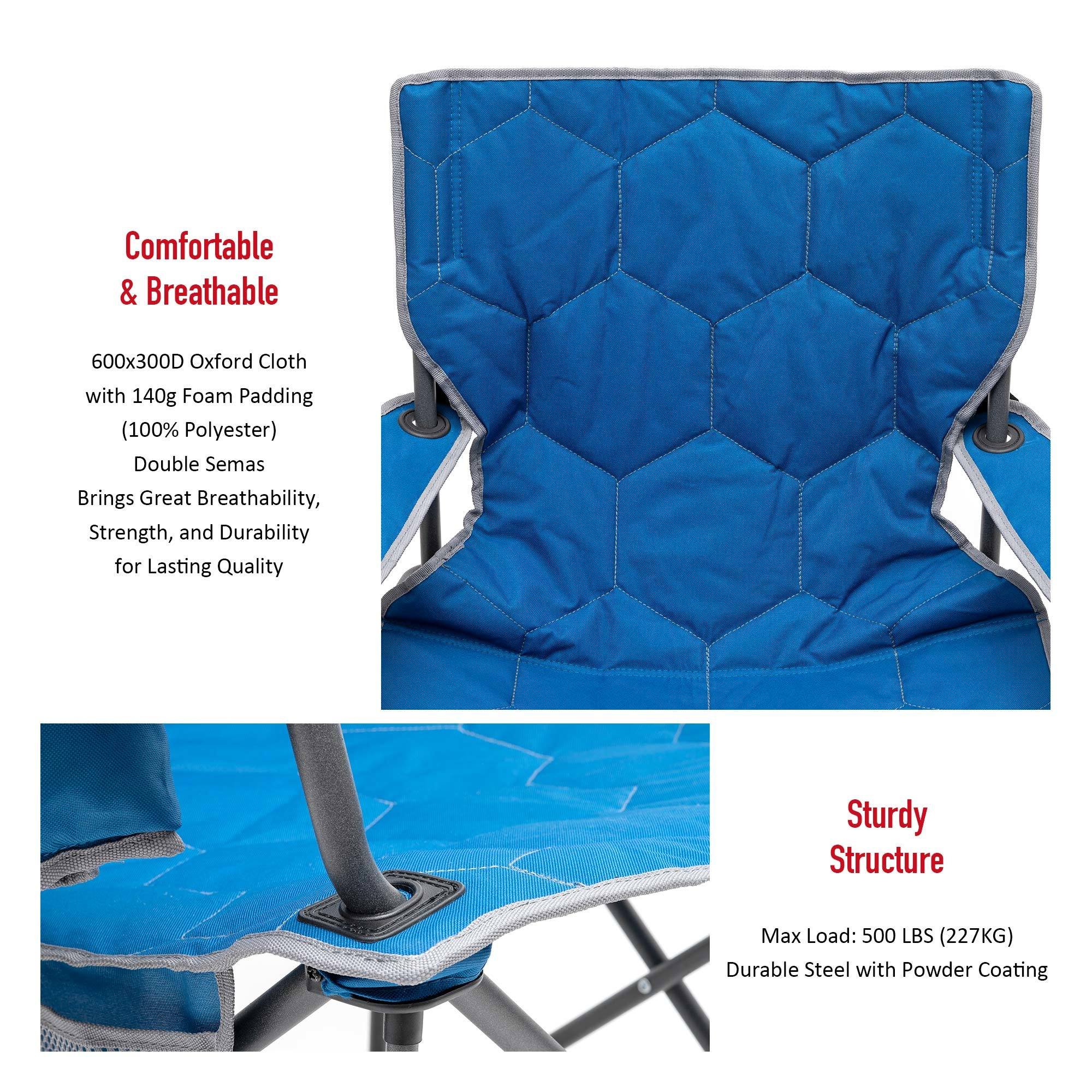 Oversized & Maximum Weight Capacity: The oversized folding chair size is 23"x37.5"x43" and the sturdy steel frame construction affords up to 300 LBS (136KG) weight capacity. This oversized & padded chair is your best partner to help you to relax and enjoy your journey.