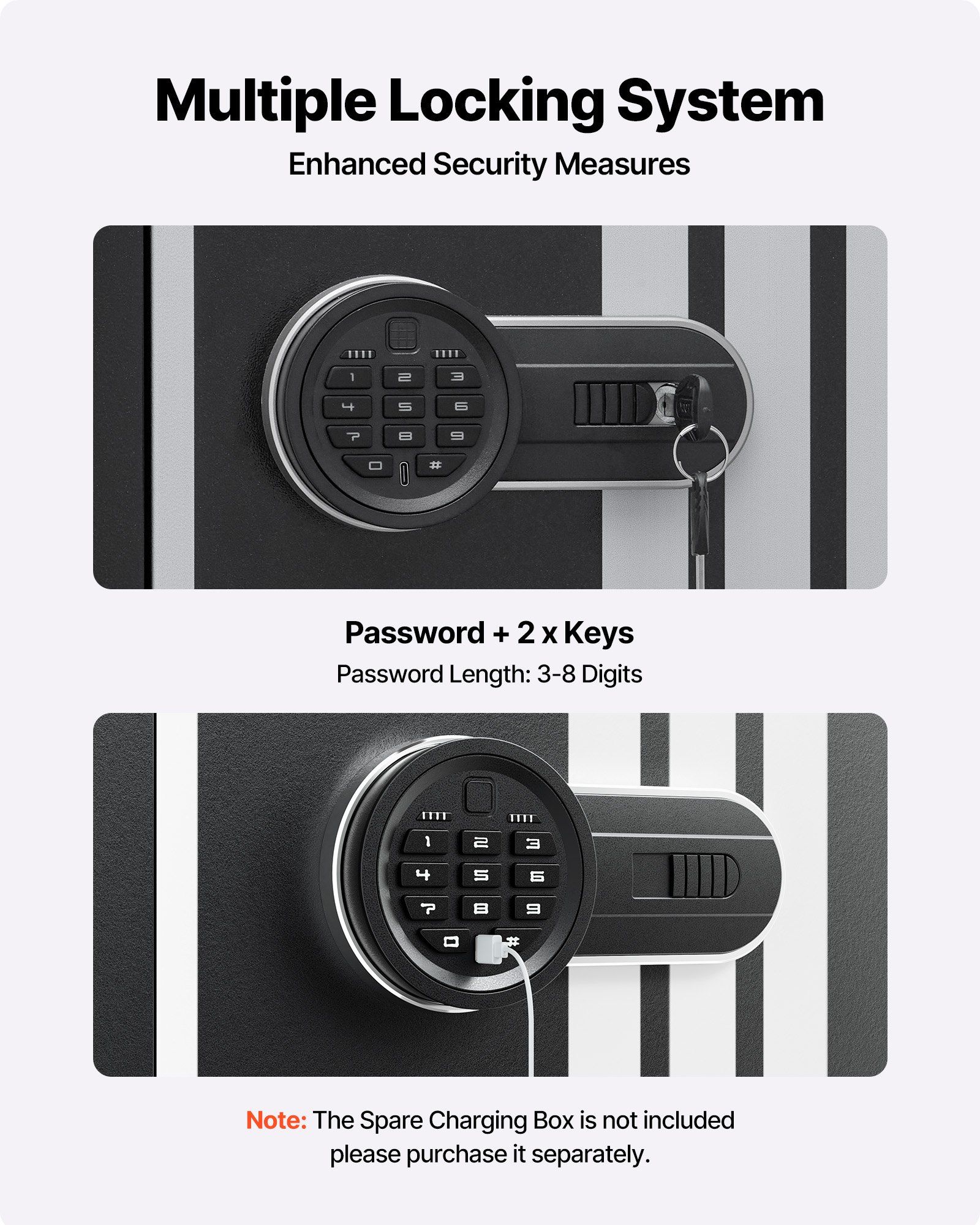 2.Smart Lock: The 9-digit touchscreen password lock provides quick access. The password can be set between 3-8 digits, with an auto-lock function for added security. It also includes an emergency key and spare charging box for easy unlocking during battery depletion. (Note: There is no battery inside, you need to buy 4 AA batteries separately.)