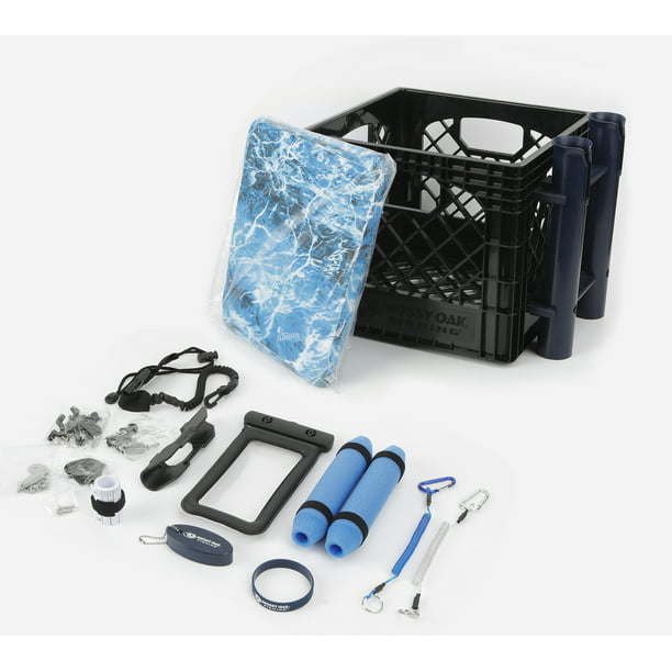 • The Kayak Fishing Accessories Crate has all you need for your next float trip. This angler kit includes a 13" kayak crate, 2 fishing rod holders, a square dry bag, clear cell phone dry bag, paddle holder, paddle leash, silica gel wristband, keychain float, folding measuring tape, 2 coiled lanyards, 2-rod floats, 5 deck loops with well nuts, and 5 deck hooks with well nuts. This crate was created to fit all of your essentials on your kayak, canoe, or paddleboard while keeping them dry and protected. The square dry bag fits perfectly inside the crate and is also removable. This kayak crate also features Nautical pattern along with blue accents. This crate is perfect for your next water trip